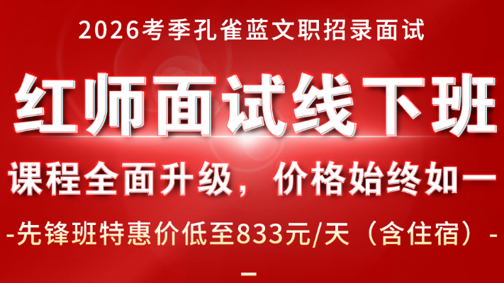 2026軍隊文職面試備戰(zhàn)已進(jìn)入關(guān)鍵階段,當(dāng)不少考生還在為面試班的昂貴學(xué)費猶豫時,紅師教育已率先打響一場誠意滿滿的“價格戰(zhàn)”——先鋒班特惠價低至833元/天,且含星級住宿。遠(yuǎn)遠(yuǎn)低于市場價!但是真正讓無數(shù)人選擇紅師、信任紅師的,是那套經(jīng)過8年沉淀、貫穿教學(xué)全程的面試培訓(xùn)“殺手锏”。