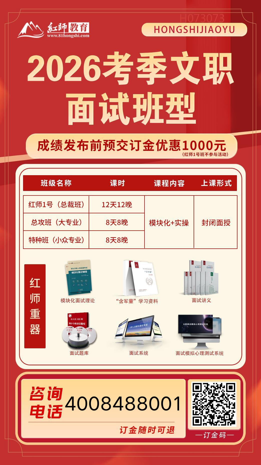 紅師文職面試線下班就是以上述四個(gè)模塊為基礎(chǔ),詳述模塊化面試的應(yīng)對(duì)技巧和方法。目前2026紅師面試總攻班火熱報(bào)名中,掃碼咨詢(xún)課程詳情。