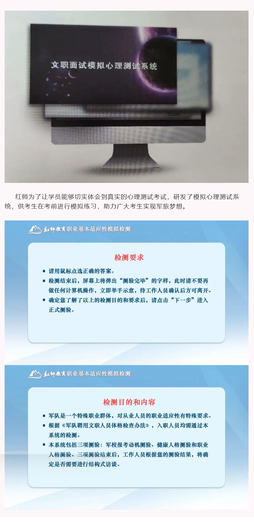 心理檢測系統是在文職體檢過程中,對其進行的心理健康程度的測試。心理測試是在計算機上回答數百道題,包括入職動機、健康人格、職業(yè)人格三個模塊。
