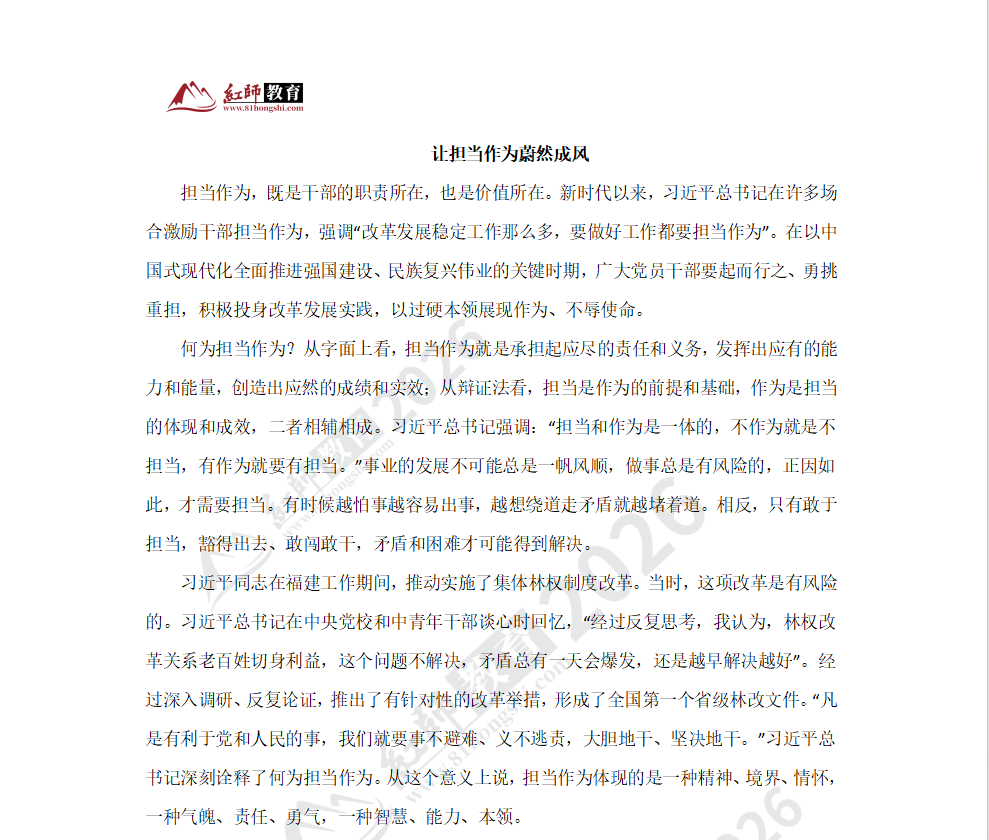 擔(dān)當(dāng)作為,既是干部的職責(zé)所在,也是價(jià)值所在。新時(shí)代以來,習(xí)近平總書記在許多場合激勵(lì)干部擔(dān)當(dāng)作為,強(qiáng)調(diào)"改革發(fā)展穩(wěn)定工作那么多,要做好工作都要擔(dān)當(dāng)作為"。在以中國式現(xiàn)代化全面推進(jìn)強(qiáng)國建設(shè)、民族復(fù)興偉業(yè)的關(guān)鍵時(shí)期,廣大黨員干部要起而行之、勇挑重?fù)?dān),積極投身改革發(fā)展實(shí)踐,以過硬本領(lǐng)展現(xiàn)作為、不辱使命。