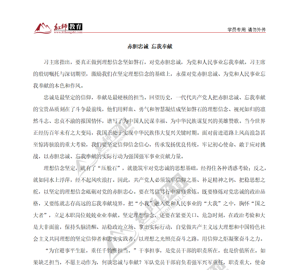 習(xí)主席指出,要真正做到理想信念堅(jiān)如磐石,對(duì)黨赤膽忠誠(chéng),為黨和人民事業(yè)忘我奉獻(xiàn)。習(xí)主席的殷切囑托與深切期望,激勵(lì)我們?cè)趫?jiān)定理想信念的基礎(chǔ)上,永葆對(duì)黨赤膽忠誠(chéng)、為黨和人民事業(yè)忘我奉獻(xiàn)的本色和作風(fēng)。