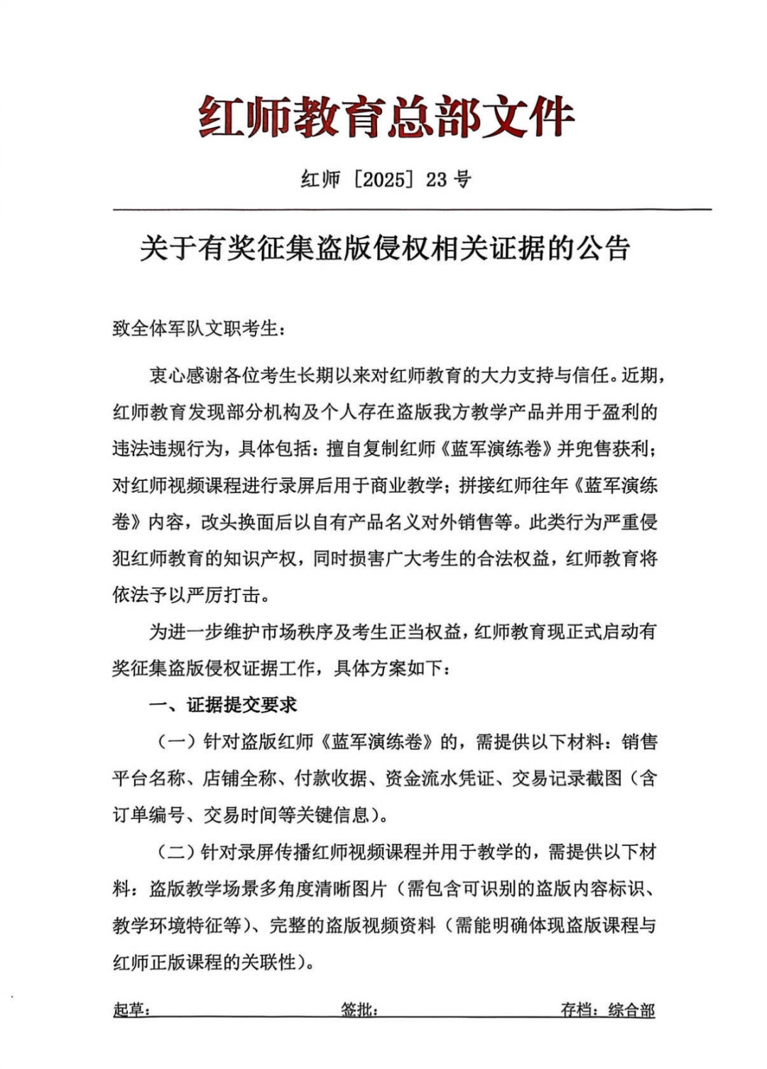 紅師教育丨關(guān)于有獎(jiǎng)?wù)骷I版侵權(quán)相關(guān)證據(jù)的公告 2025-11-25