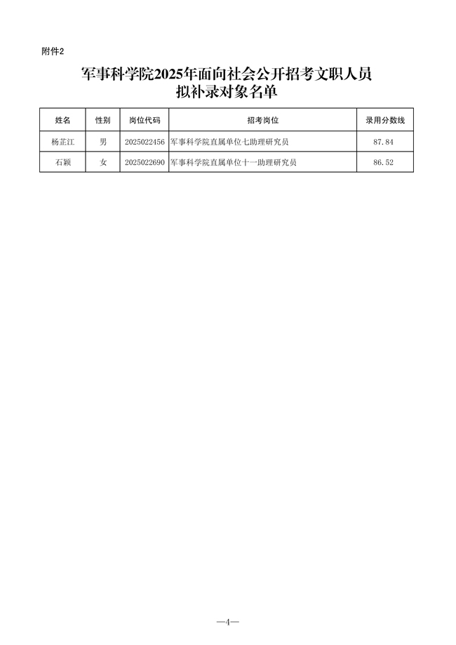 原文標題:公示軍事科學院2025年面向社會公開招考文職人員第五批擬錄用對象、補錄對象名單