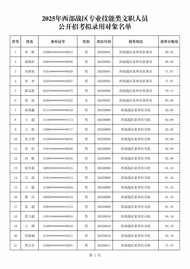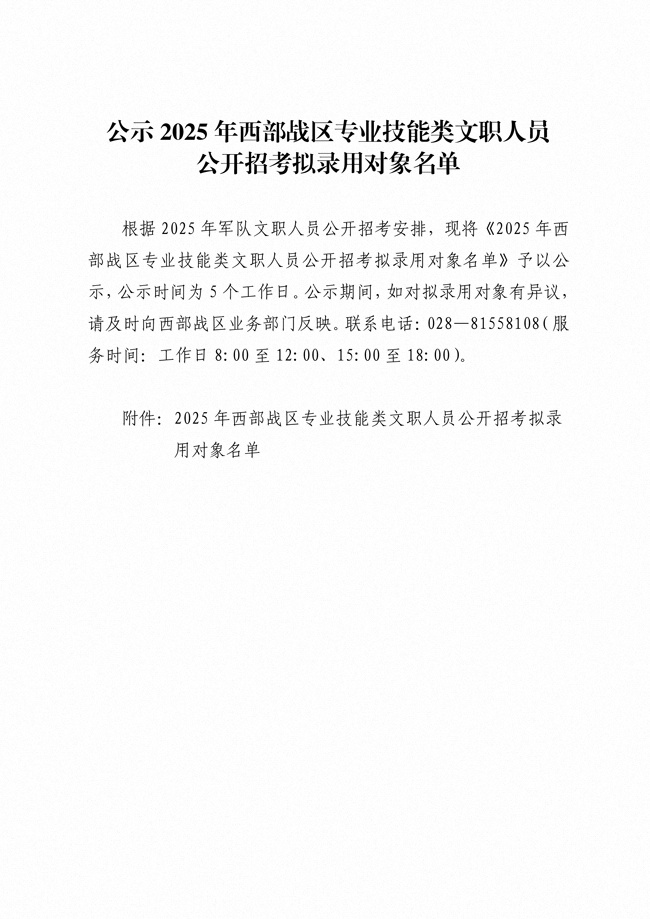 原文標(biāo)題:公示2025年西部戰(zhàn)區(qū)專業(yè)技能類文職人員公開招考擬錄用對象名單
